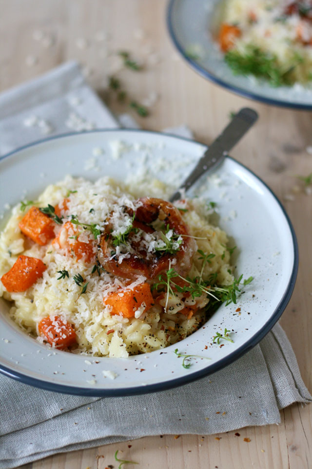 Onze favoriet als we iets meer willen dan alleen rijst is deze van Yellow Lemon Tree met pompoen, knapperige pancetta en geitenkaas.