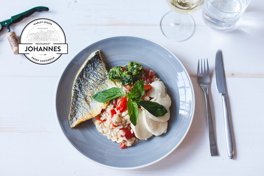 Een fijn recept van Marley Spoon voor risotto caprese met op de huid gebakken dorade.