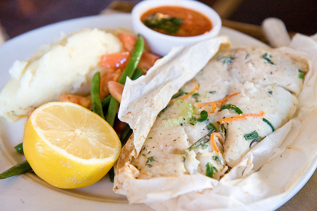 1. En papillotte – Haal het vel van de filets, schil en kook de krieltjes. Snijd de ui fijn, blancheer de groenten kort en vouw samen met de vis en een scheutje wijn ‘en papillotte’, in een stukje aluminiumfolie of bakpapier goed dicht. Stoom dit gaar in de oven of op de BBQ. Of…