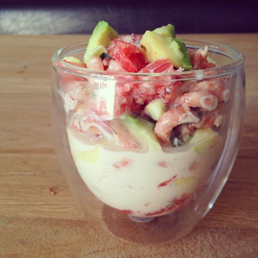 2. Maak de garnalencocktails en zet ze koud. Houd de avocado nog even achterwege: je hebt kans dat de blokjes anders zullen verkleuren.