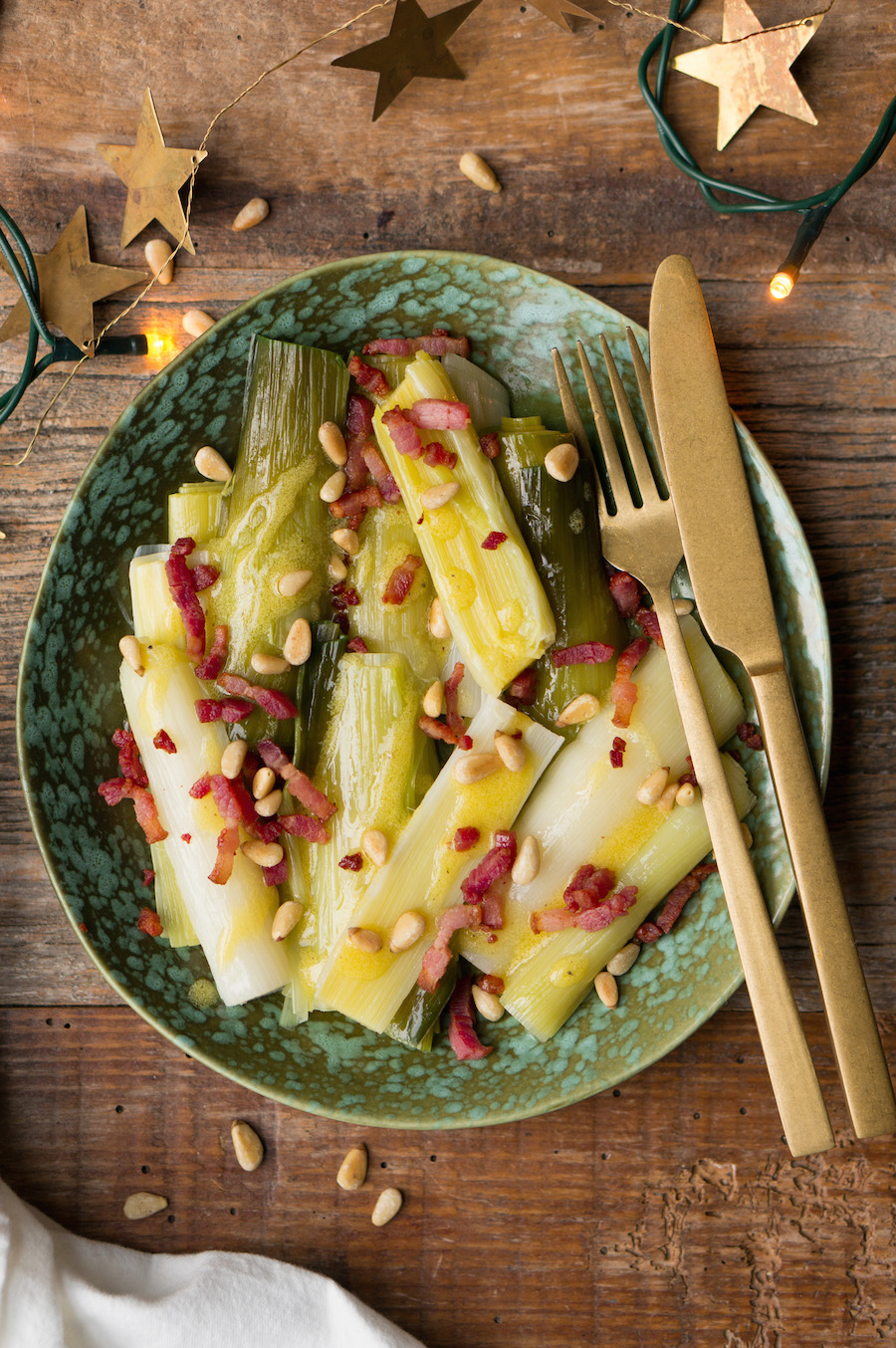 Daarbij een fantastisch bijgerecht: zoete prei met vinaigrette en spekreepjes.