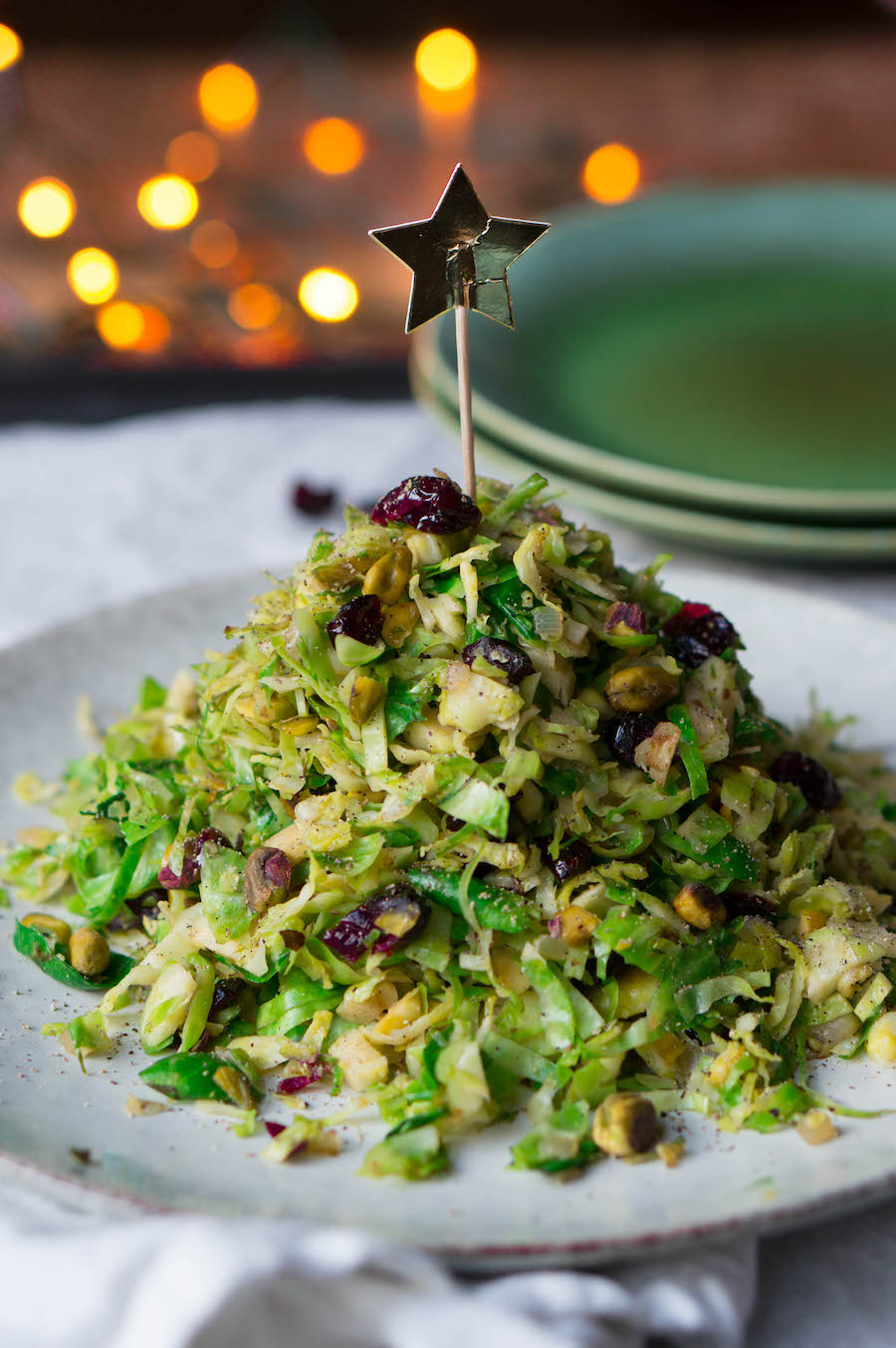 Nog meer fijne groente: deze geschaafde spruitjes met pistache, cranberry’s en Parmezaanse kaas zijn lekker kerstig.