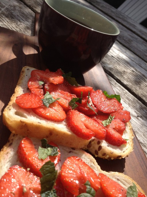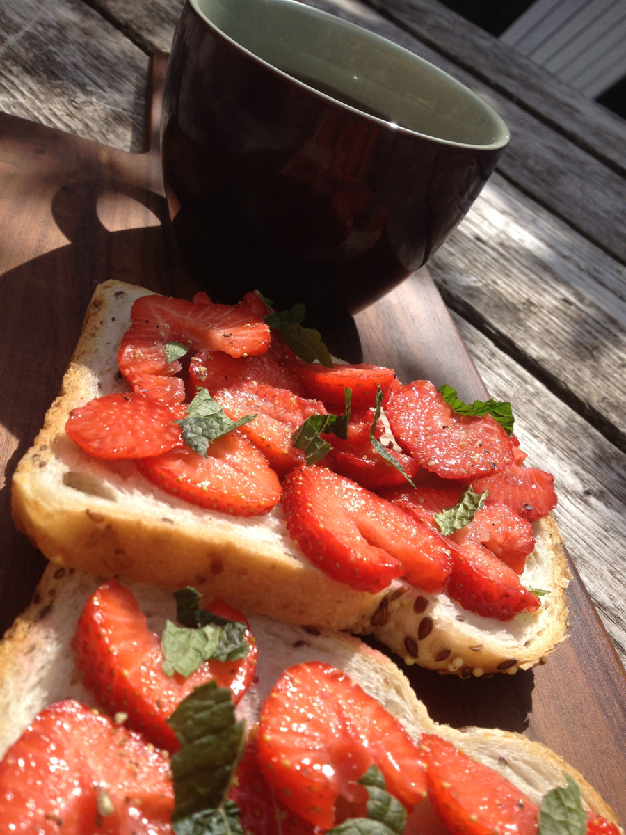 Ik geniet alvast voor tijdens een heerlijke lunch: broodje aardbeien met verse munt uit eigen (moes)tuin.