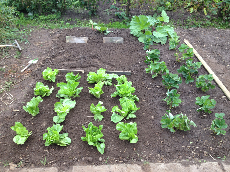 De verkregen andijvie, rabarber en aardbeien – keurig in het gareel op één van mijn akkertjes. Op het tussenstukje dat nog open is, zaai ik zelf winterpostelein.