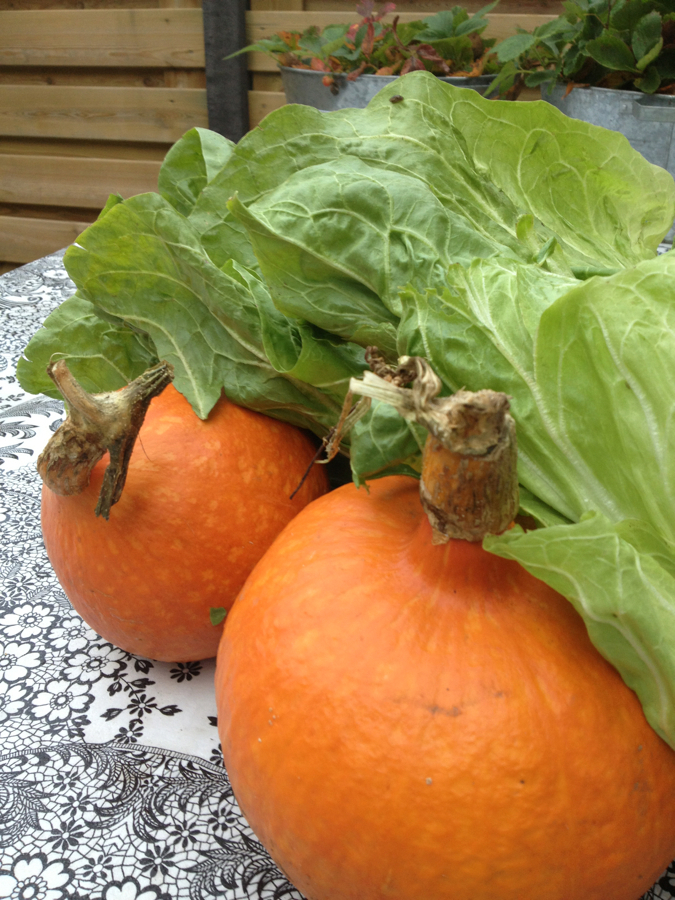 Twee prachtige pompoenen en twee grote stronken groenlof, de ‘score’ na een middag moestuinieren.