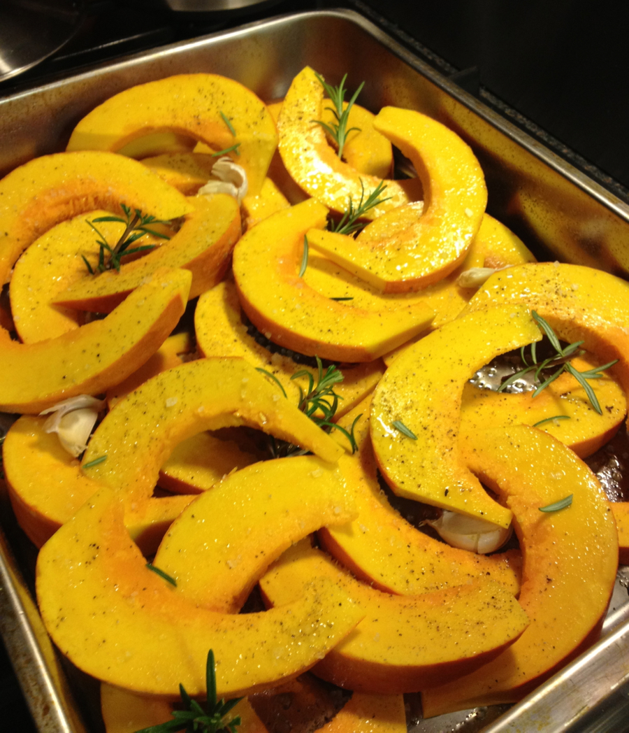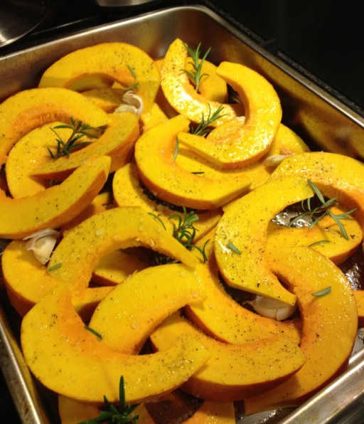 De gewassen en gesneden pompoen is klaar om in de oven te grillen. Besprenkeld met olijfolie en voorzien van wat verse rozemarijn en knoflook in de schil.