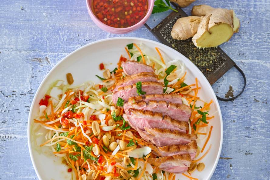 Geroosterde eendenborst op Vietnamese salade. De lichtzoete eendenborst past perfect bij zo’n Aziatische salade.