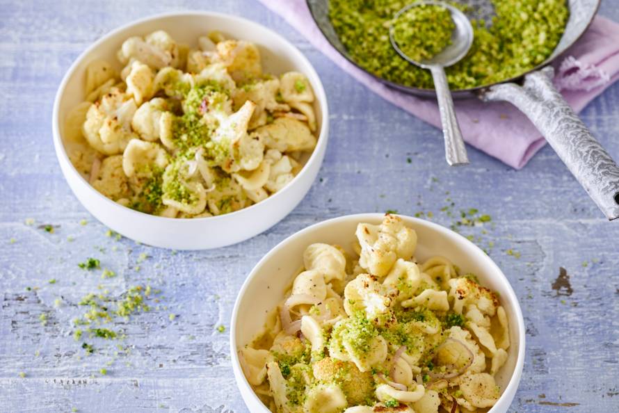 Pasta met geroosterde bloemkool en krokant broodkruim. Bloemkool en pasta? Een topcombinatie! Zeker als je de groente roostert in de oven.