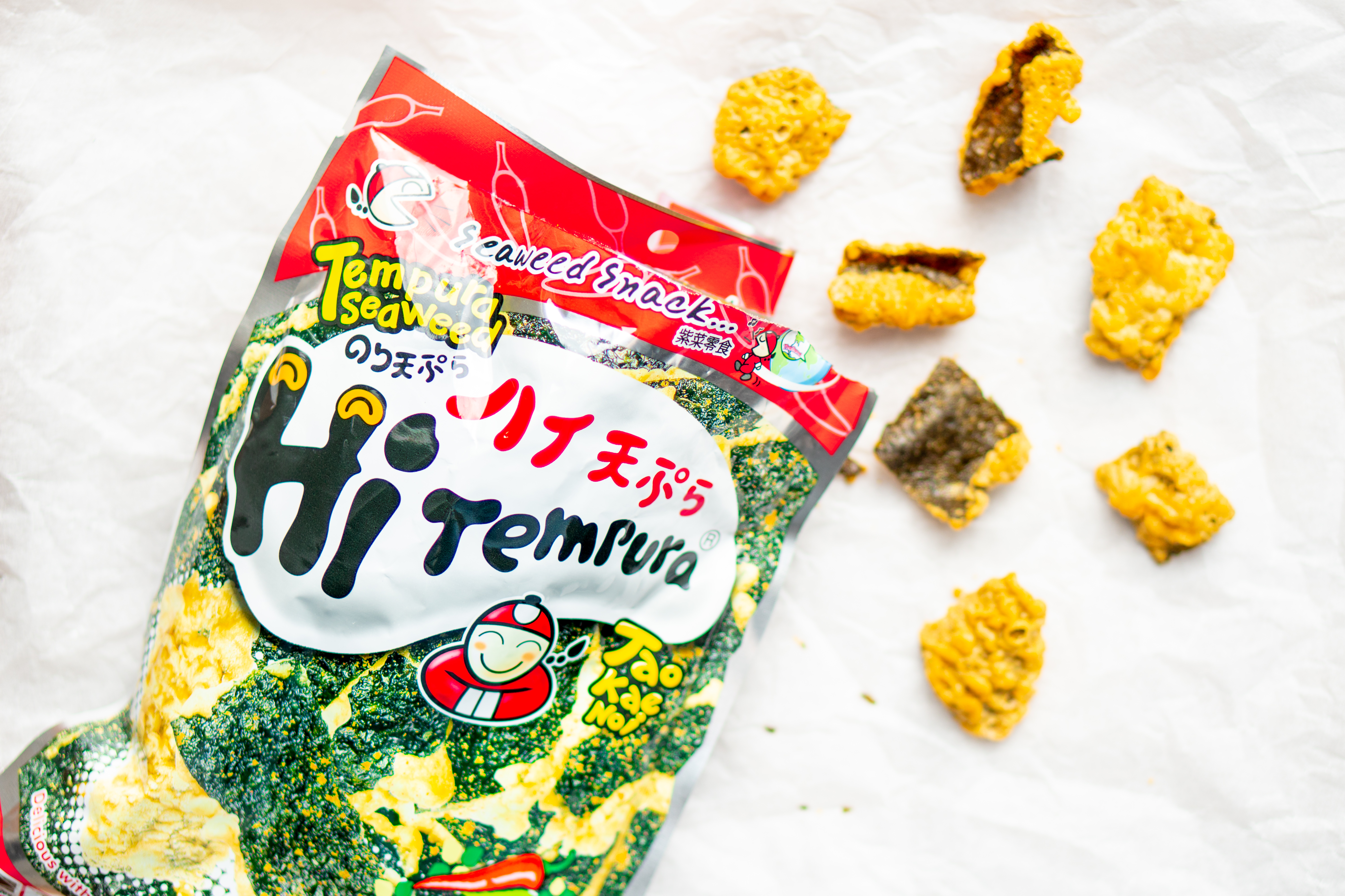 Nori tempura, ook wel tempura seaweed genoemd (op de verpakking) of nori chips wordt omschreven als een zeewiersnack. Je ziet ze tegenwoordig in elke toko wel liggen en ze springen ook direct in het oog vanwege die kleurige verpakking met dat lachende poppetje.