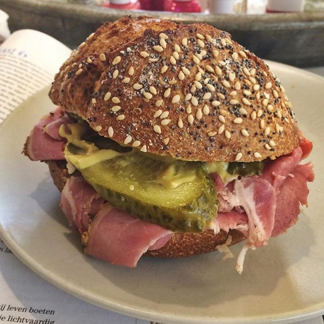 6. De volkoren bol met pastrami, mosterd, mierikswortel en augurk van delicatessenwinkel JWO om mee te nemen (Tweede Goudsbloemdwarsstraat 1)