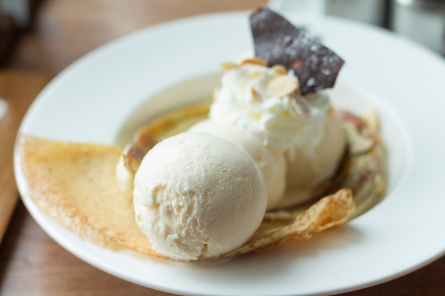 Een warme crêpe of pannenkoek, zo uit de hete pan, en dan geserveerd met een ijskoud bolletje roomijs. Zo lekker!