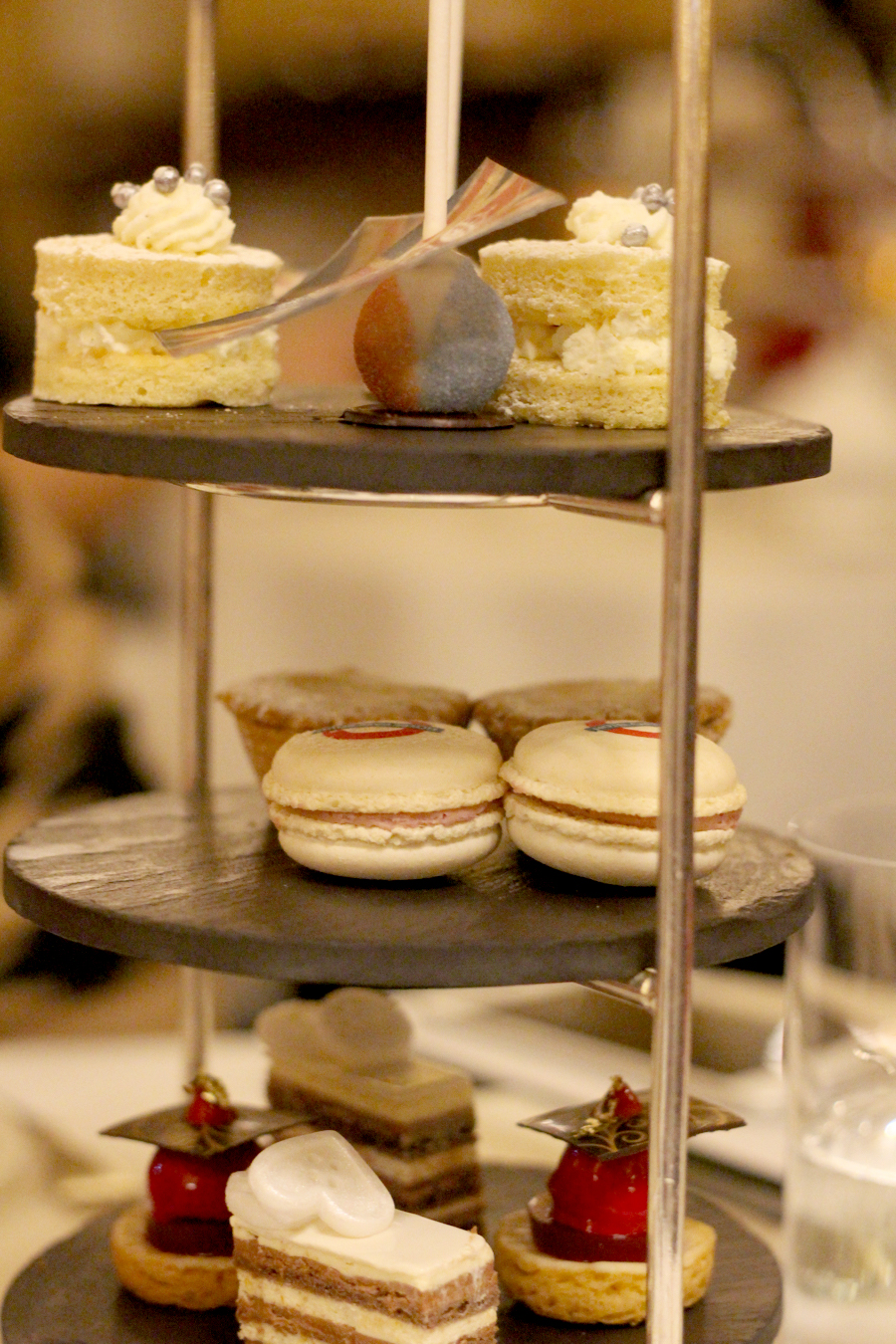 Op de etagères liggen onder andere klassieke finger sandwiches met komkommer, toastjes met zalm en kwartelei, een mini beef Wellington, een melkbroodje met garnalen, macarons, fruitcake, biscuit-gebakjes en chocoladepracht. En natuurlijk het belangrijkste: de scones met clotted cream, frambozenjam en lemon curd.