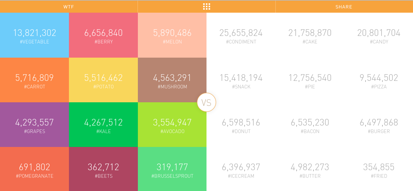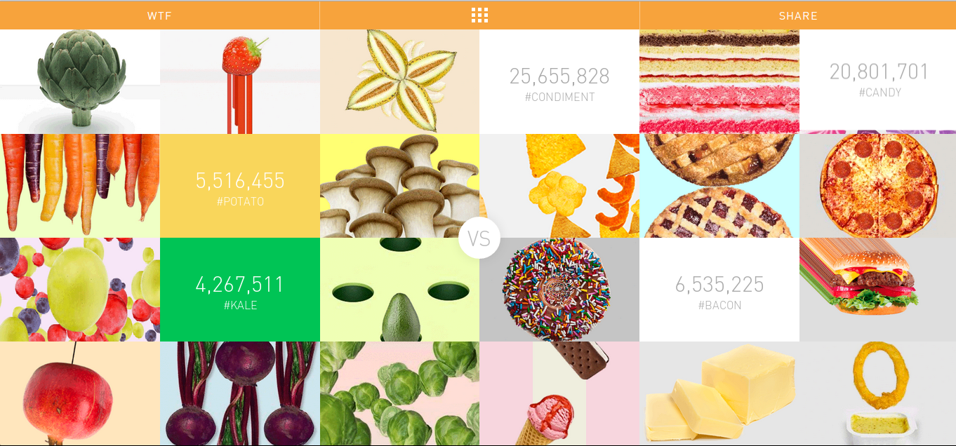 De site is een verzameling van (hysterisch!) bewegende plaatjes van eten met de bijbehorende hashtag en het aantal plaatsingen op social media. Volgens Ginestro is wat we tweeten en instagrammen een weerspiegeling van wat we doen in de offline wereld.