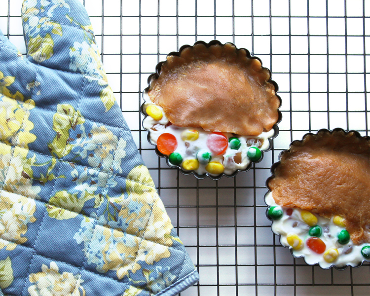 Dit ‘hartige’ taartje is gemaakt van candy corn, glazuur en fruitsnoepjes.