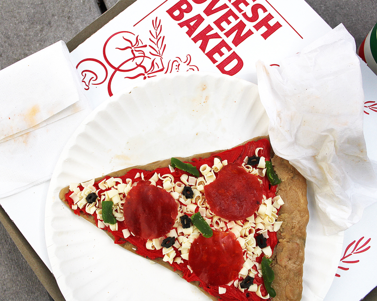 Pizza pepperoni? Nope. Deze pizza is gemaakt van koekjesdeeg, witte chocoladekrullen, drop en fruit leather.