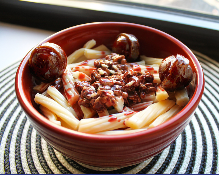 Deze pasta bolognese is gemaakt van drop, Snickers, aardbeiensaus en lolly’s!