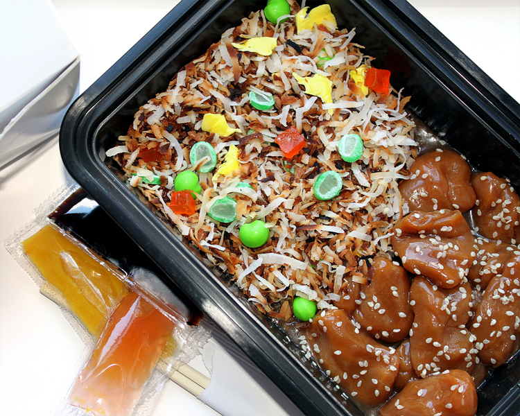 Voordat je je tanden in deze Chinese afhaalmaaltijd zet, eerst nog even dit: hij is gemaakt van karamelsaus, kokos en fruitsnoepjes.