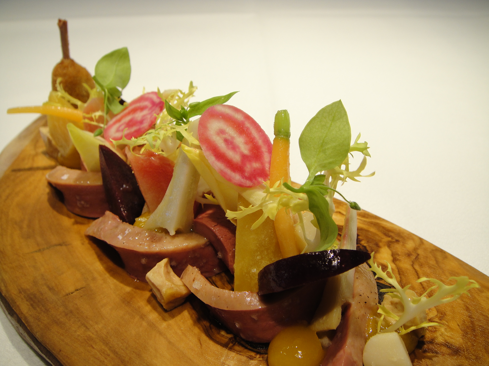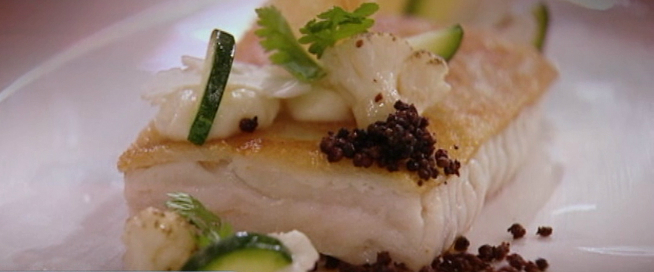 Het tweede gerecht was rogvleugel met een krokante broodkorst op een crème van bloemkool met daarbij verschillende bloemkoolbereidingen: rauw, gebrand en gekookt. De mini courgettes, krokante aardappel en uitgebakken mosterdzaadjes gaven het gerecht kleur en een mooi evenwicht aan de begeleidende dressing van tomaten en sjalotten.