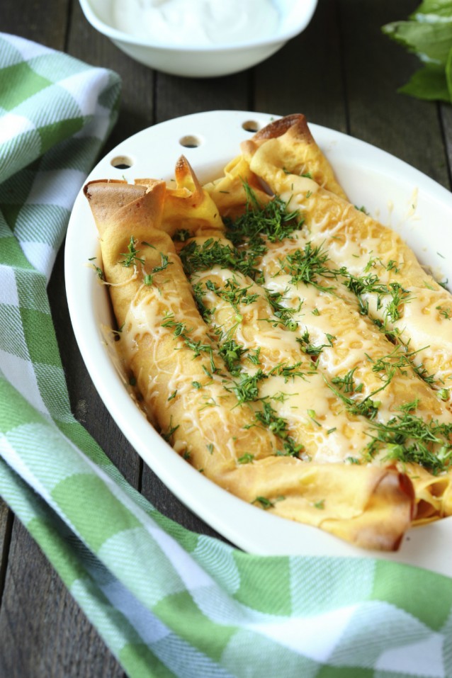 Fruit een ui met een teen knoflook en een handje peterselie. Voeg vervolgens een doosje champignons toe samen met een beetje gehakt en bak gaar. Vul de pannenkoeken met het mengsel, rol op en top met geraspte kaas. Bak nog even in de oven.