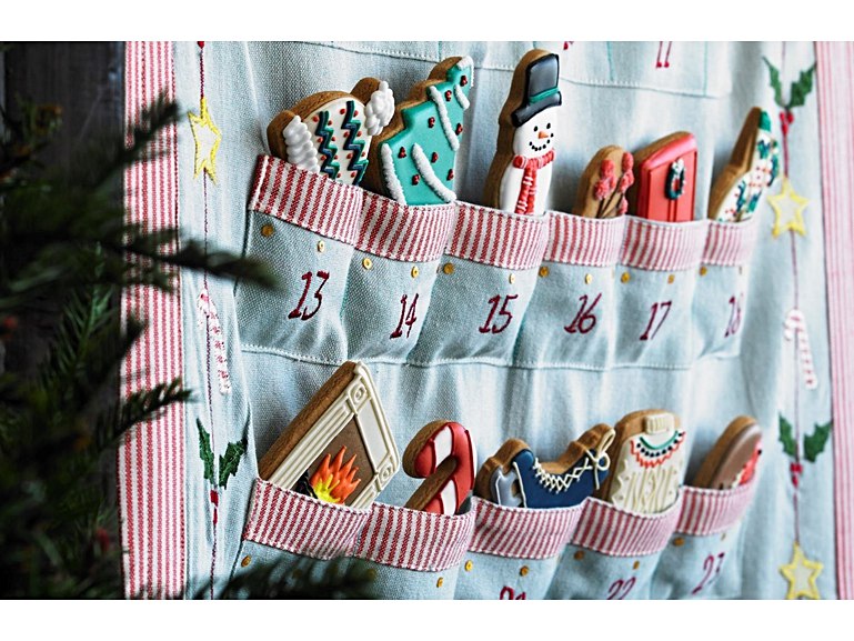 Biscuiteers bakte een blik vol kerstkoekjes. Bestel er de bijpassende stoffen adventskalender bij en stop in elk vakje een koekje, voor elke dag tot kerstmis.