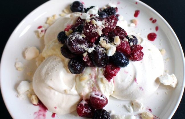 Eton Mess is ons go-to toetje als we gasten over de vloer krijgen. Top met verse (ontpitte) kersen en ander rood fruit.