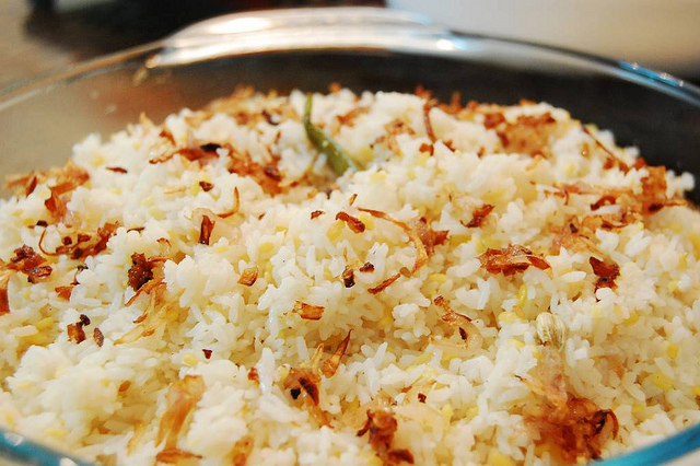 De rijst wordt gegarneerd met amandelen, pistachenootjes, gebakken ui, sinaasappelschijfjes of een gekookt ei. En eet je het met schapen- of lamsvlees? Dan heet het een biriyani.