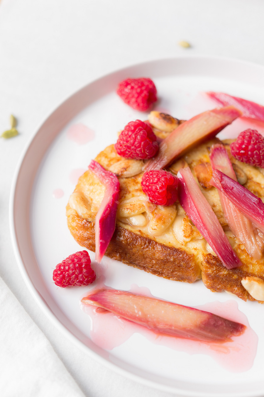 Een verrassende twist: week de brioche in kokosmelk met kardemom en serveer met knalroze rabarber en verse frambozen.