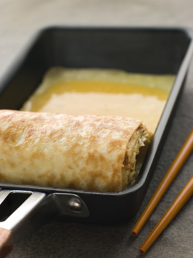 De Japanse omelet wordt gebakken in een rechthoekige tamagoyaki-pan. De techniek draait om het continu oprollen van dunne laagjes ei. Je giet steeds een klein beetje ei in de pan, rolt het halfgare ei op en voegt dan een nieuwe laag toe. Dit proces wordt herhaald tot een dikke, opgerolde omelet ontstaat. Het resultaat? Een luchtige, subtiele, zoete omelet met een zijdezachte textuur.
