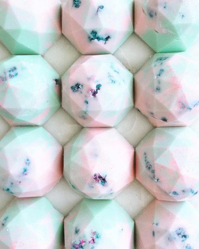 Jenna Rae Cakes – een taartenshop in Canada – noemt ze ‘cake gems’: deze snoepjes in de vorm van edelstenen, gemaakt van cake met een laagje chocolade eromheen. Deze mooie roze-met-blauwe hebben de smaak van suikerspin.