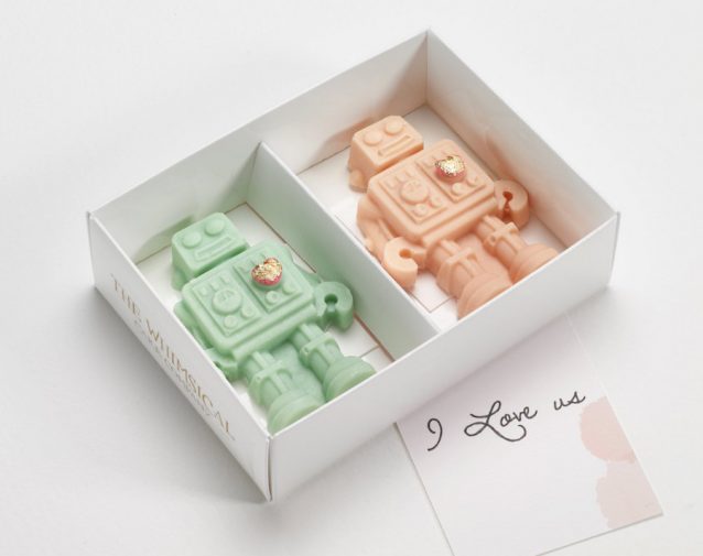 Whimsical Cake Company uit Engeland maakt deze chocoladerobots die je kunt bestellen via Etsy. Ze zijn gemaakt van Belgische witte chocolade met een hartje van eetbaar bladgoud. Bijna zonde om op te eten!