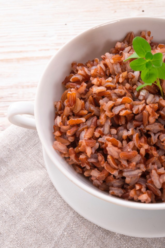 De rode rijst is een halfronde rijstsoort, en heeft flink wat tijd nodig om te koken (ongeveer 40 minuten!). Niet bepaald snelkookrijst, dus, maar wel erg lekker: stevig, met een bite, zoals wilde rijst.