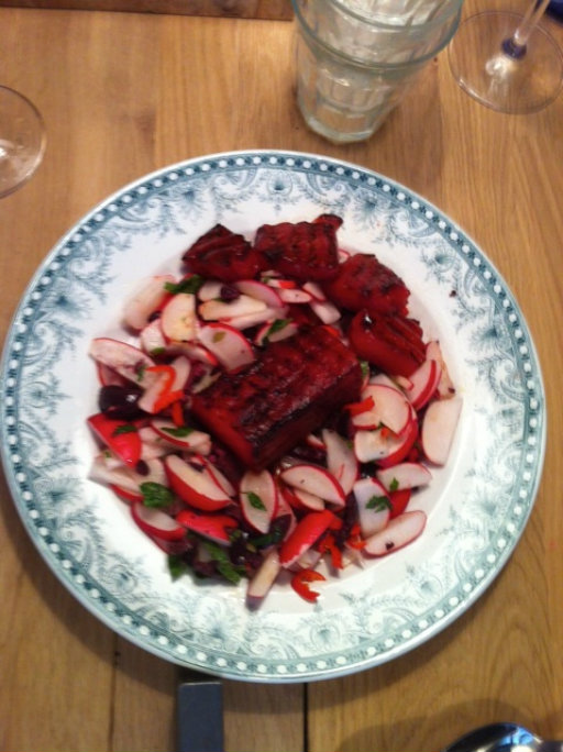 Pfoe, dat kan ik moeilijk zeggen. We hebben hele huwelijksdiners gekookt vanuit mijn keuken. Maar twee redelijk geniale gerechtjes van de afgelopen maanden waren mijn vegetarische tonijn (a.k.a. gegrilde watermeloen) met een salade van radijs en zwarte olijf. Verder maakte ik laatst weer een keer een oester met bloodymary gelei en bleekselderij. Echt top!