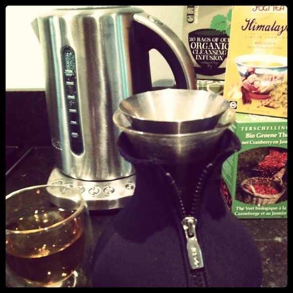 2. Mijn favoriete theepot is de glazen karaf van EvaSolo met een warmhoudjas-met-rits. Zowel voor losse thee als zakjes te gebruiken.