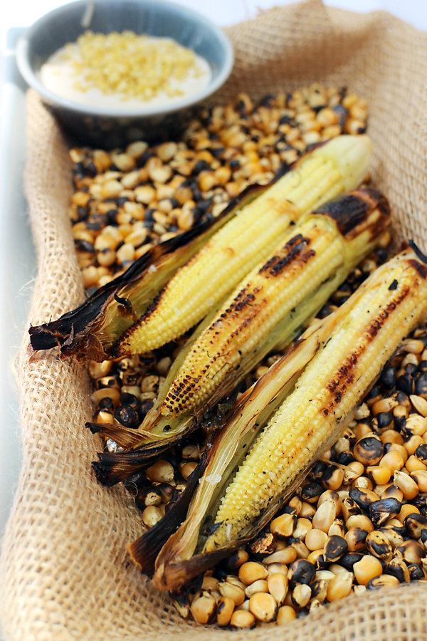 Ook gespot bij RIJKS: mais in de hoofdrol. Deze geroosterde mini-mais met oesterbraaïolie is het ultieme barbecuegerecht, maar dan wel volledig vega.