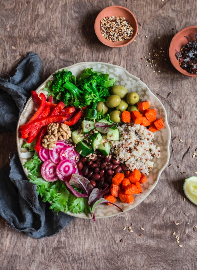 De basis is vaak iets met veel vezels, zoals bruine rijst of wilde rijst, quinoa, freekeh, couscous of parelgort. En dan komen de lekkere groentes: geroosterde kikkererwten, pompoen, zoete aardappel, broccoli, babyspinazie, bloemkool… En natuurlijk een aantal fijne toppings. Denk aan: plakjes avocado, gegrilde kip, knapperige tofu of taugé.