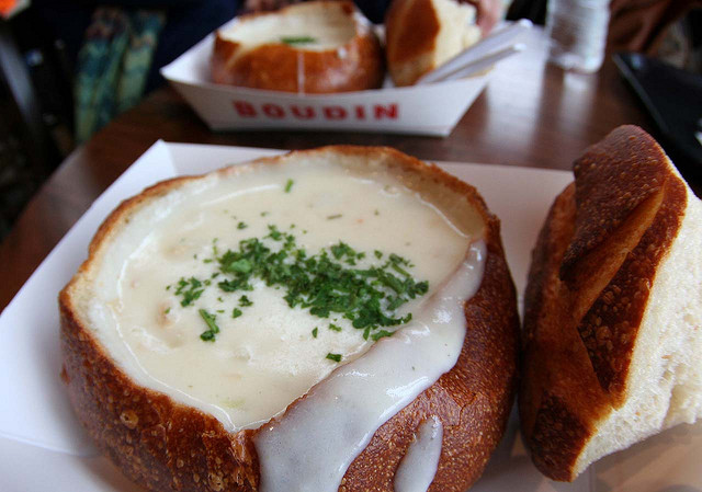 Clam chowder is een romige soep gemaakt met schelpdieren, stukjes aardappel en vaak stukjes uitgebakken spek. Vooral bij Fisherman’s Wharf wordt dit gerecht veel geserveerd (op Culy schreven we er eerder een uitgebreid artikel over). Hier wordt de clam chowder in een uitgehold zuurdesembrood geserveerd. Zo lekker!