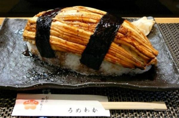 Deze joekel van een nigiri sushi is gemaakt door het Japanse restaurant Umewaka. De enorme nigiri is gemaakt met Anago (zeepaling) filets en kost $ 33.