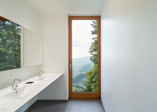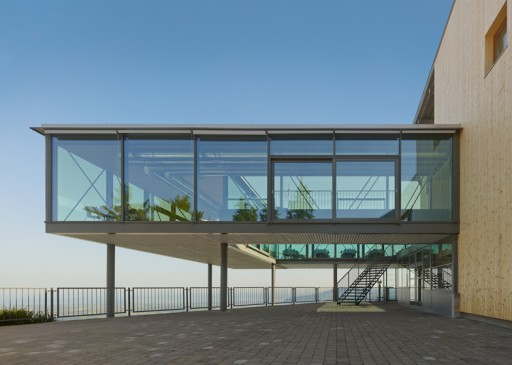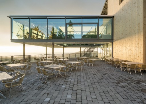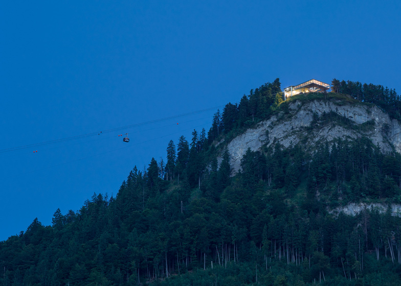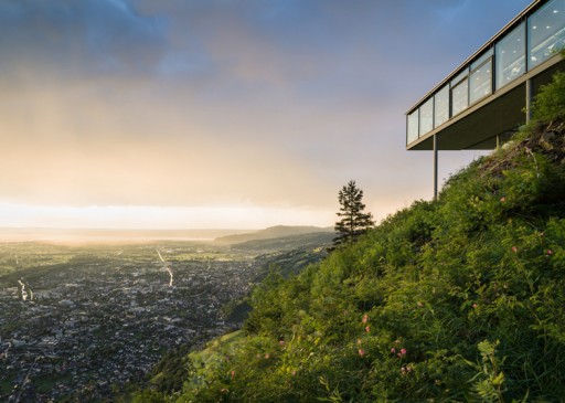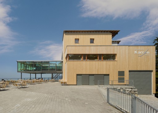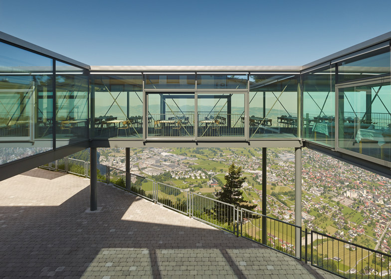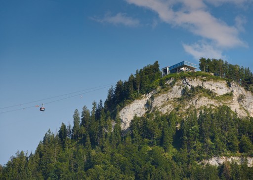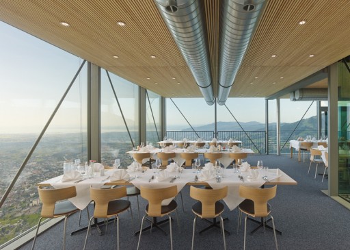 Vanuit het restaurant, dat overigens ook een kleine kilometer boven zeeniveau ligt, heb je uitzicht op niet alleen Oostenrijk, maar ook op Zwitserland, Duitsland en de prachtige Bodensee.