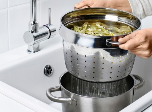 Twee accessoires zijn handig bij deze pan: een vergiet-inzet (de meeste grote merken, maar ook IKEA, hebben deze, vaak onder de naam ‘pasta-inzet’) om snel en makkelijk af te gieten, en een (bamboe) stoommandje om op de pan te zetten. Zo kun je echt alles met deze pan.