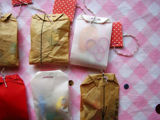 5. Vouw twee punten van de bovenkant van het zakje naar elkaar toe, met een stukje touw ertussen.