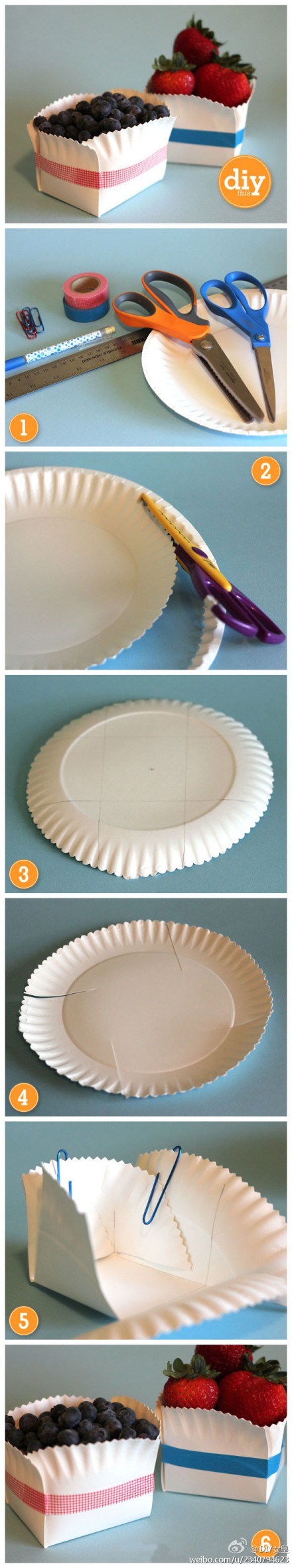 Deze leuke mandjes maak je heel simpel van kartonnen bordjes en een lintje en staan ontzettend leuk op je tafel of in de keuken. Gebruik ze om fruit in te bewaren, of andere dingetjes als snoepjes, koekjes en ga zo maar door.