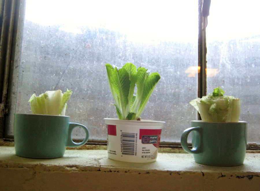 Het beste werkt het met sla romaine of little gem’s, waarbij je de onderkant in een bakje met een laagje water zet en wachten tot het begint te groeien. Ververs om de paar dagen het water en voor je het weet verschijnt er een nieuwe krop. Handig of handig?!