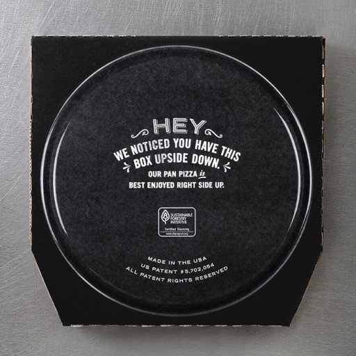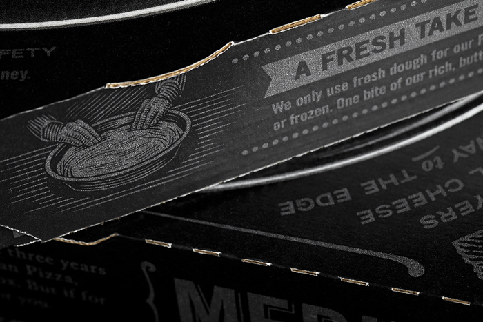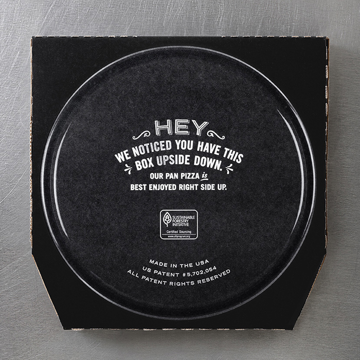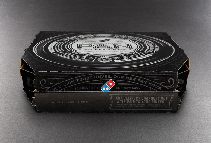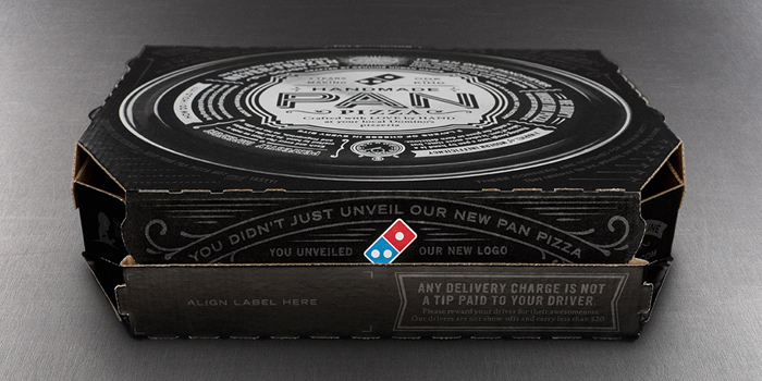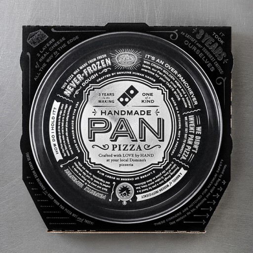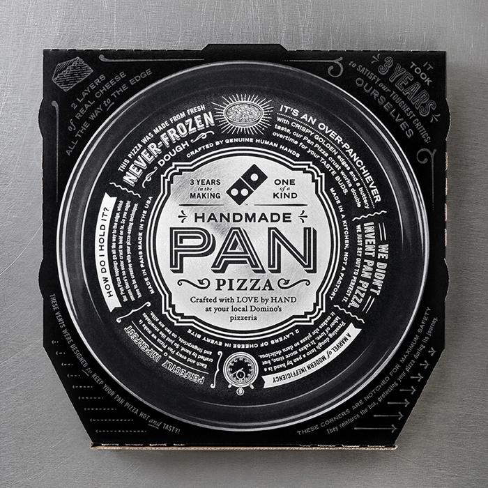 Domino’s pizza gooit het roer in Amerika om met deze prachtige nieuwe verpakking voor hun handgemaakte pan-pizza’s. In plaats van de blauw met rood gekleurde dozen, krijgen mensen die een pizza bestellen in Amerika nu deze prachtige zwart-witte verpakking.