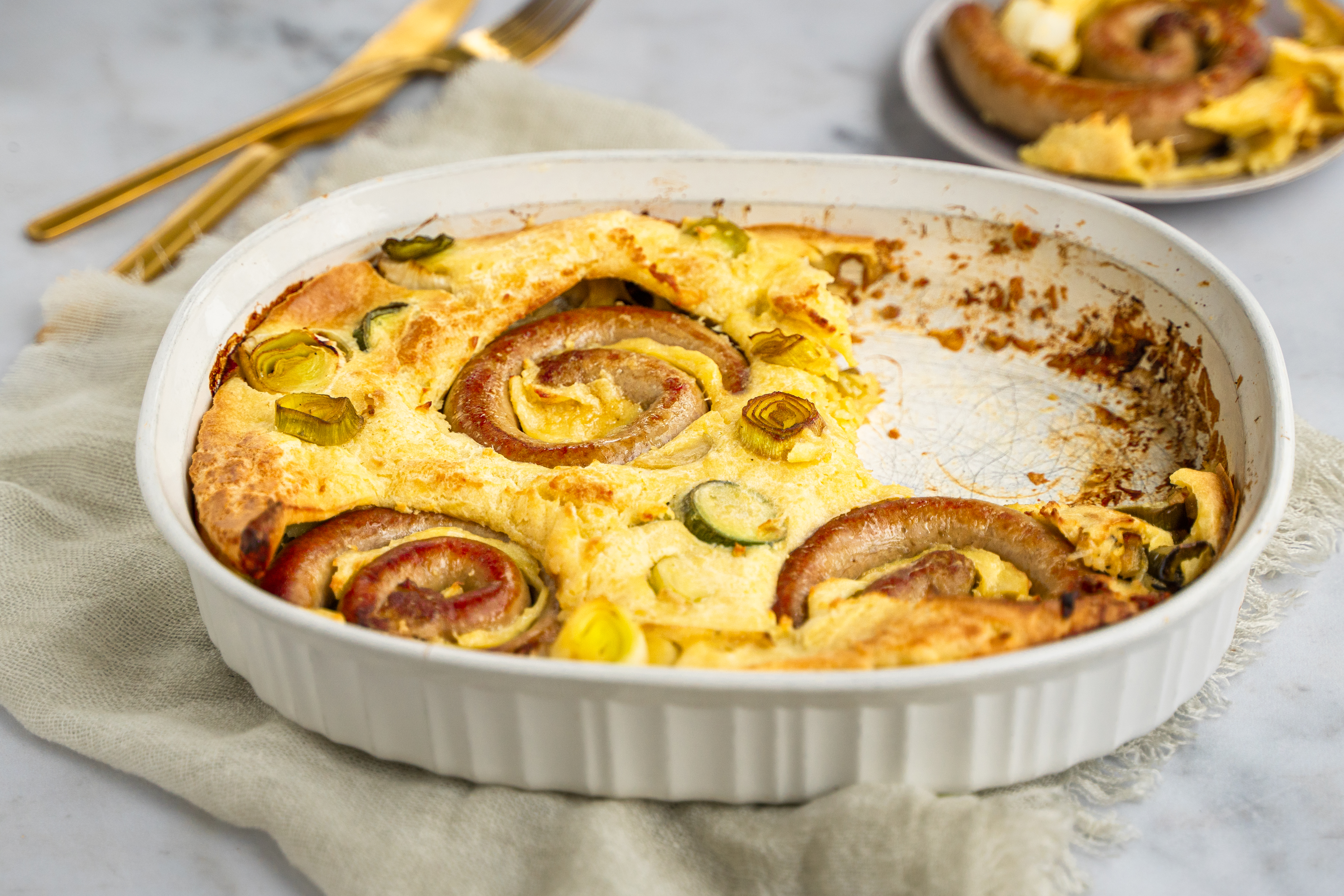 > Naar recept: Toad in the hole is dé ovenschotel voor kinderen (met worstjes, appel & prei)