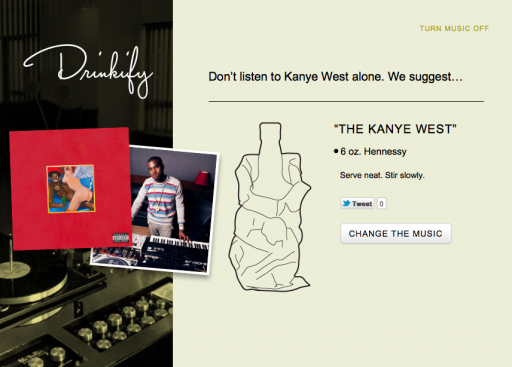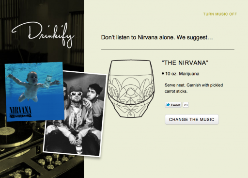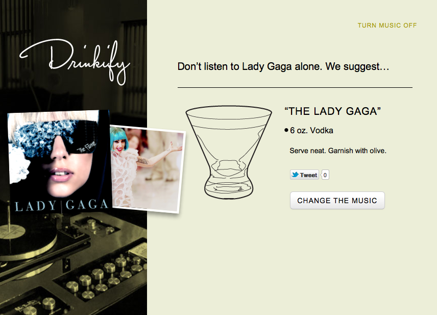 Grappige site: Drinkify. Typ je favoriete muzikant of band in, en je krijgt direct een matching cocktailrecept. Mooi vormgegeven en erg kloppend.