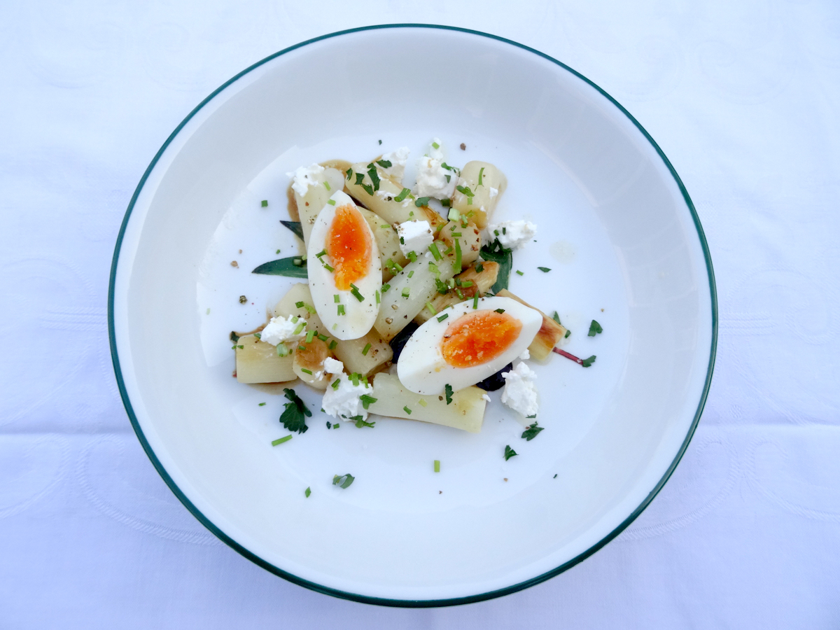 Gebakken asperges met eieren en geitenkaas