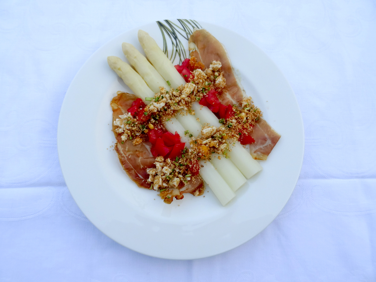 Gekookte asperges met ei, tomaat en krokante ham