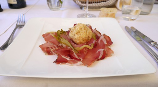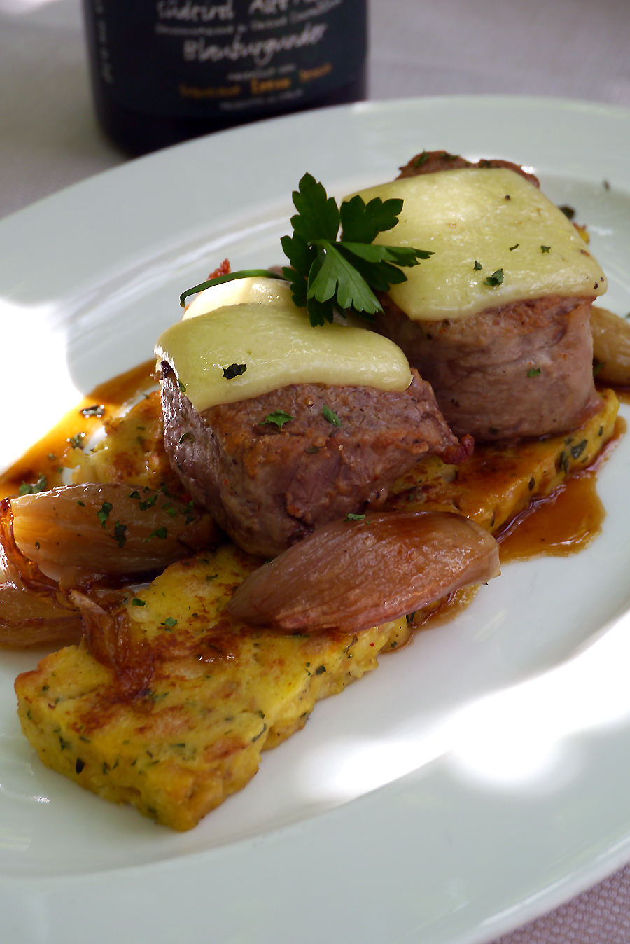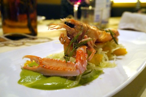 Vis staat volop op elke menukaart. Van St. Jakobsschelpen, langoustines (zoals hieronder te zien), krab en tonijn tot forel, saibling (vis met veel aroma), snoekbaars (Zander genaamd) en stockfishgeröstel. Omdat er vele witte druivensoorten worden verbouwd, is er keuze te over. De sauzen en kruiden die worden gebruikt, bepalen wat mij betreft de wijnkeuze. Bijvoorbeeld Riesling bij een meer naturelle smaak, Chardonnay bij de aromatische saibling en de Gewürztraminer bij de smaakrijke Stockfischgeröstel.