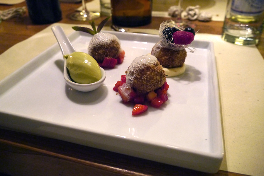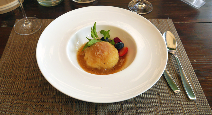 Wat toetjes betreft staan er zowel zoete als hartige gerechtjes op de kaart. Zoals een apfelkiechl (Südtirol kent vele appelboomgaarden) of Apfelstrudel. Heerlijk met een glaasje Gewürztraminer Spätlese of een Rosenmuskateller Passito. Of een Knödel met daarin verborgen een abrikoos, met daarbij aardbeitjes en een saus van oud broodkruim en suiker (à la wentelteefjes). Persoonlijk ben ik niet zo van de toetjes, dus wat mij betreft wordt het een mooi kaasplateau.