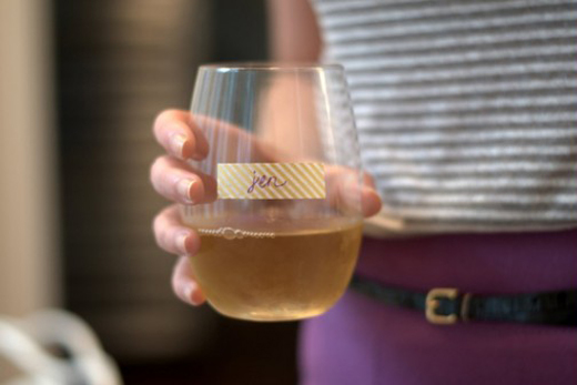 Natuurlijk kun je wijnglas markers gebruiken (figuurtjes of sieraden die je aan je wijnglas hangt) om je eigen glas snel te herkennen maar bij wijnglazen zonder pootje wordt dit al lastiger. Een simpel stukje Washi tape ziet er leuk uit én is een stuk goedkoper en makkelijker. Schrijf de namen van je gasten zelf op de tape of laat iedereen bij binnenkomst zijn eigen naam opschrijven.